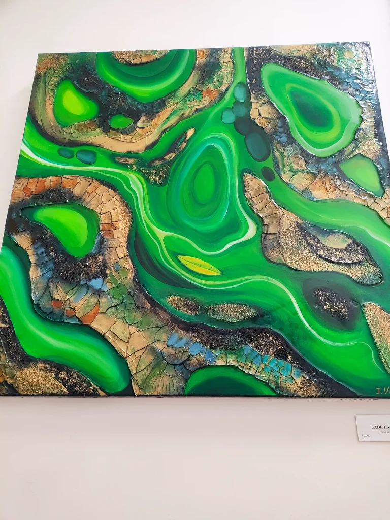 Irina Velman (Russia-NZ), previously featured in Our Harbour (#116, 2023), works with both traditional and experimental techniques. You’ll see vivid floral composition alongside abstract pieces created with liquid acrylics. Irina is also a designer — her work appears on a wide range of gift items and stationery produced by a New Zealand-Australian company (Photo 2).