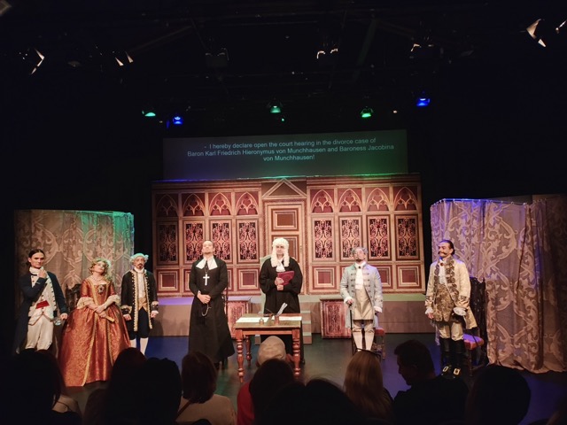 Задник сцены с «семейными портретами»  рода баронов Мюнхгаузенов — это удивительная находка Сергея Фомина (его идея, воплощенная в жизнь через  постеры  хороших  и даже известных картин). А какова «библиотека с фолиантами» в других сценах  в имении барона! Сергей Фомин, Александр Химич,  Станислав Высоцкий — Браво!